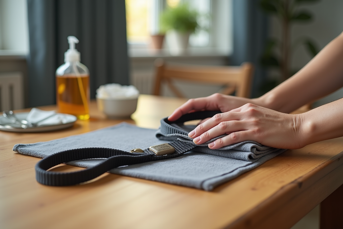 Avant de commencer le nettoyage, rassemblez les outils nécessaires : un chiffon doux, une eau savonneuse et, si besoin, une brosse à poils souples. Cela permettra d’éliminer les saletés sans endommager la laisse.